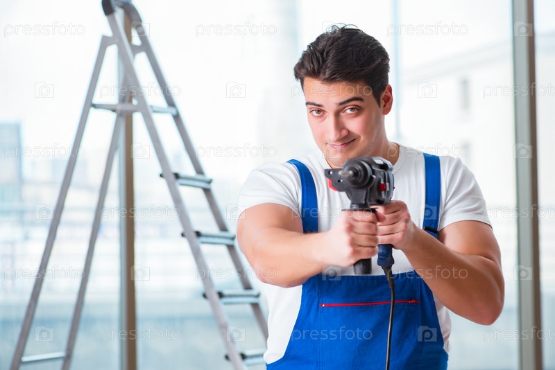 Молодой работник с ручной дрелью
