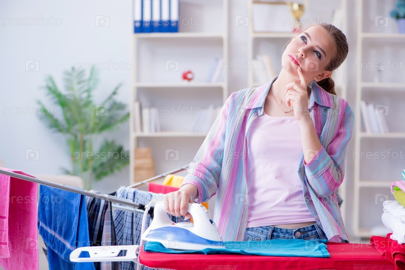 Печальная женщина гладит одежду