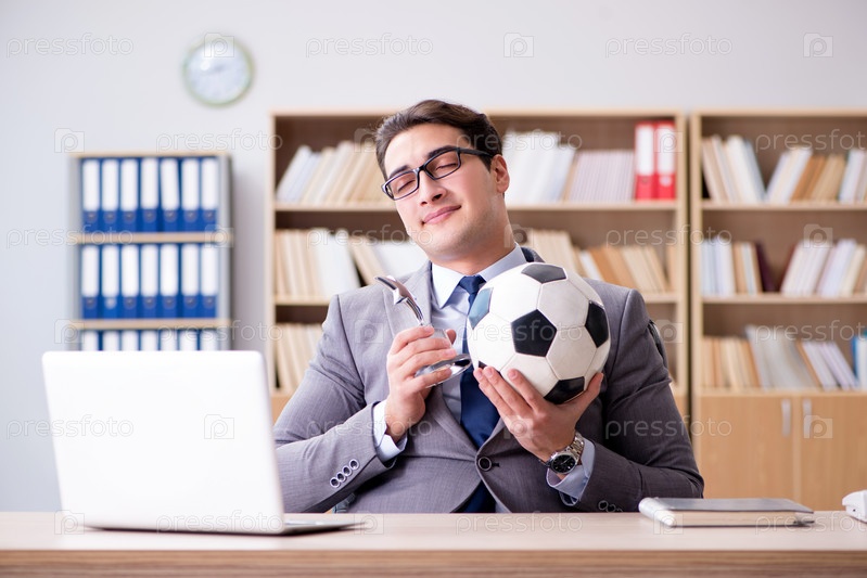 Бизнесмен с футбольным мячом в офисе