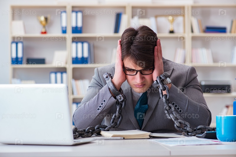 Бизнесмен привязан цепями к своей работе