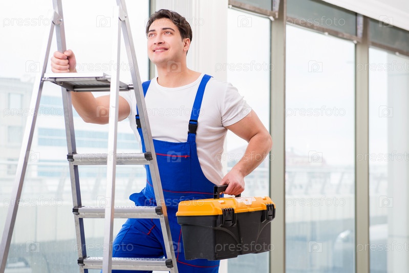 Молодой ремонтник лезет на лестницу на строительной площадке