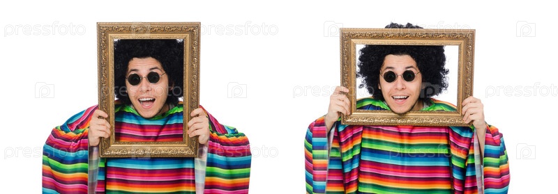 Смешной мексиканец с фоторамкой на белом