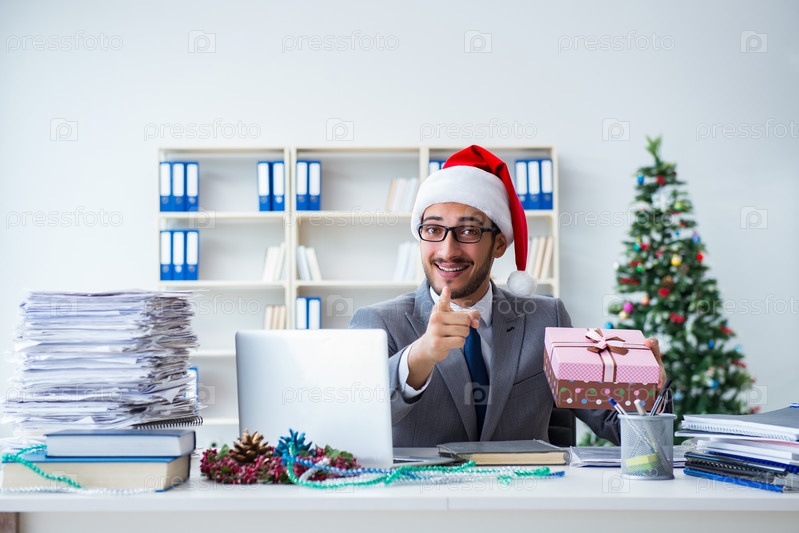 Молодой бизнесмен празднует Рождество в офисе