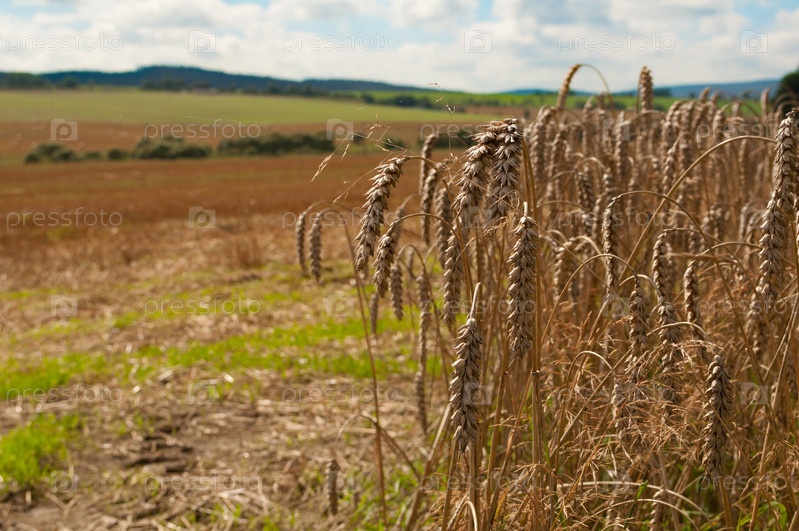 Сельский пейзаж со спелыми колосьями пшеницы на переднем плане