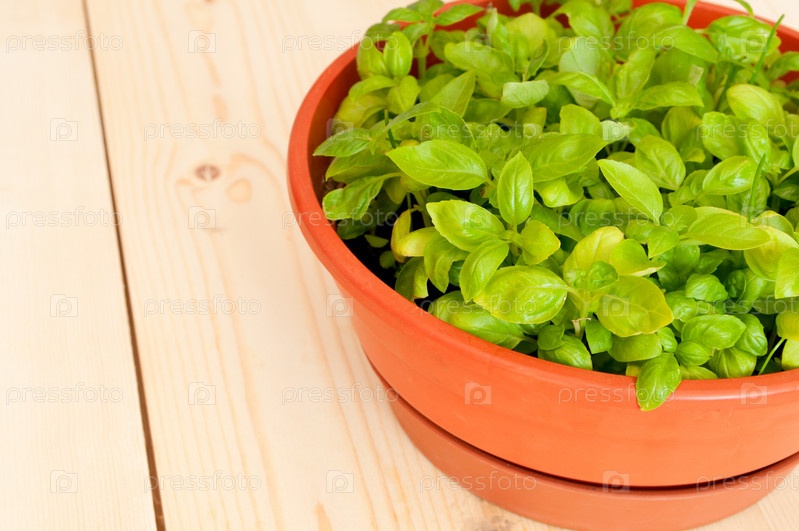 Свежий базилик в цветочном горшке на деревянном столе
