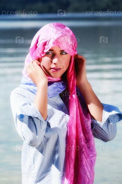 Молодая женщина, закутанная шарфом на фоне озера