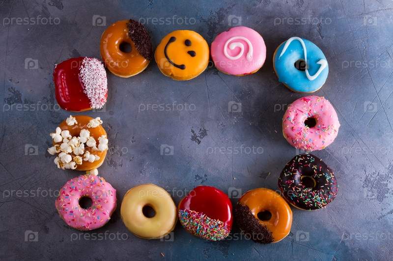 Сладкие пончики на сером фоне