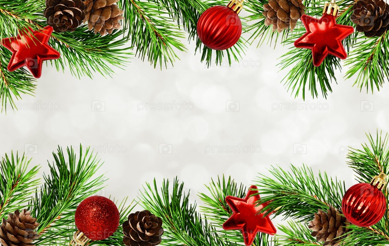 Праздничная рамка с елочными веточками, шишками и шарами