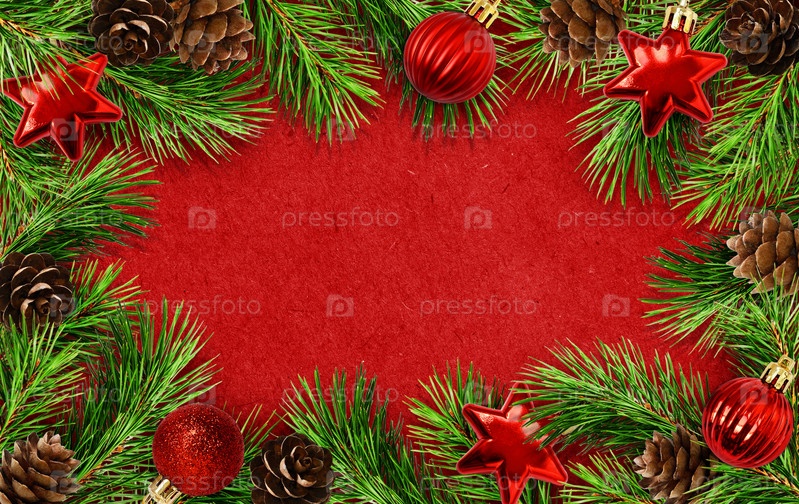 Праздничная рамка с елочными веточками, шишками и шарами