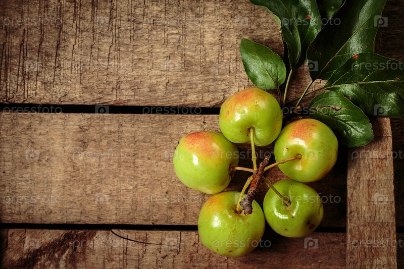Свежие зеленые яблоки на старой коробке