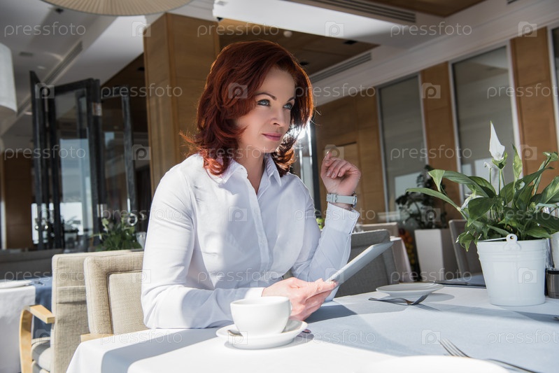 Задумчивый пожилой предприниматель с планшетом в ресторане