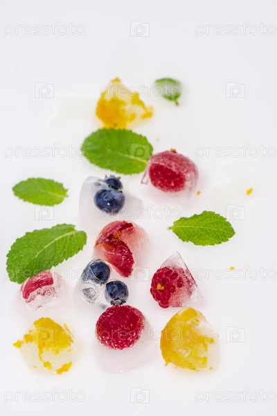 Фрукты и ягоды в кубиках льда с мятой
