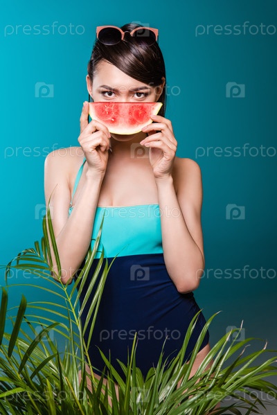 Портрет молодой женщины Азии в купальнике с арбузом