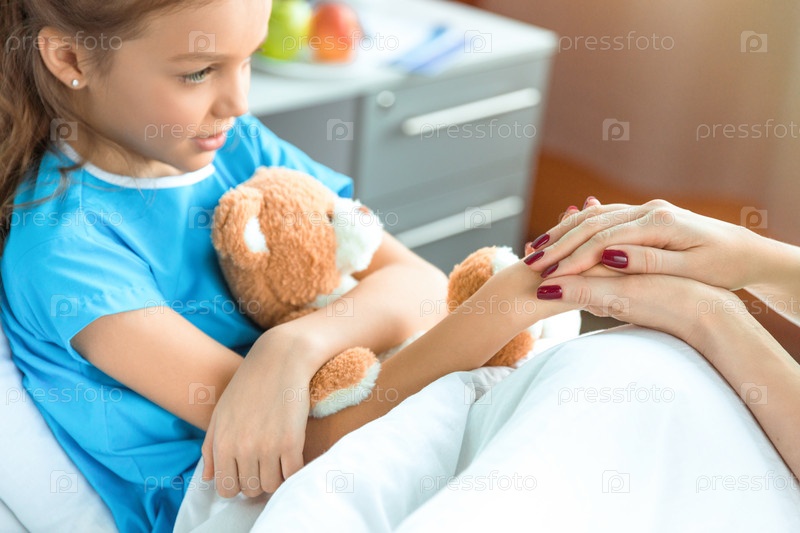Доктор и маленький пациент с плюшевым мишкой, держась за руками в больнице