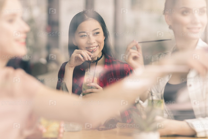Молодые девушки пьют коктейли вместе в кафе