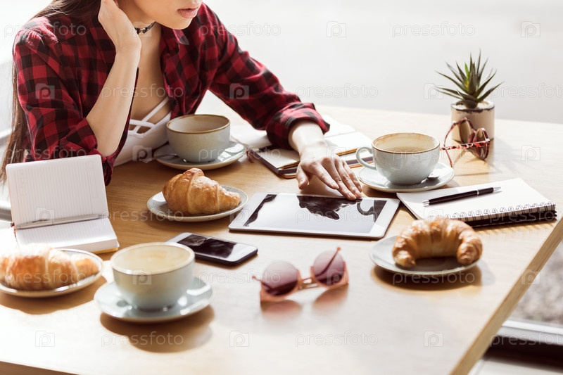 Используя цифровой планшет в кафе