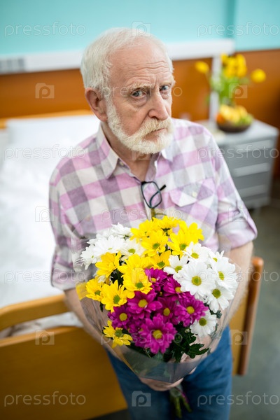 Пожилой мужчина с цветами в больнице