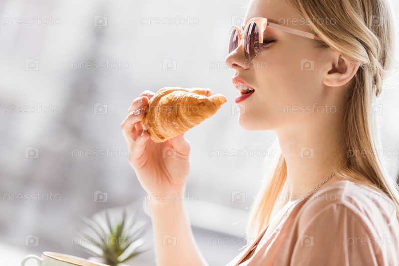 Молодая женщина ест круассан, сидя в кафе