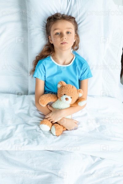 Вид сверху маленького пациента с плюшевым мишкой, лежа на кровати в больнице