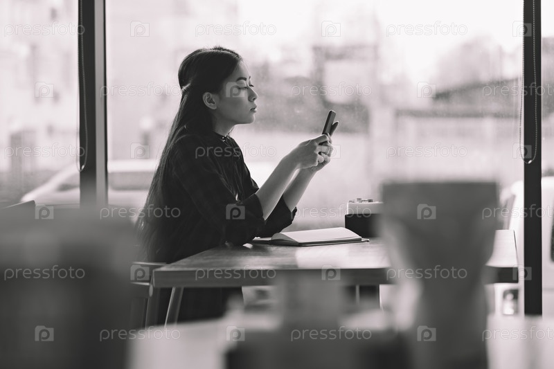 Привлекательная брюнетка в кафе