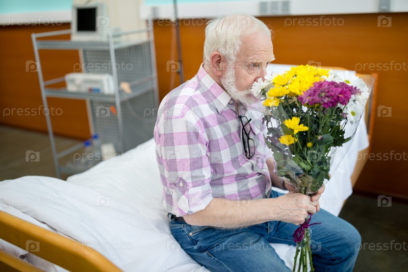 Пожилой мужчина с цветами в больнице