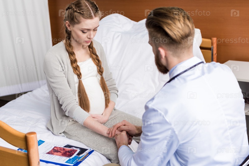 Бородатый мужчина врач обнадеживает расстроенную беременную женщину