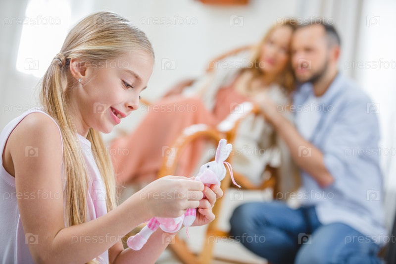 Девочка играет с игрушкой кролика