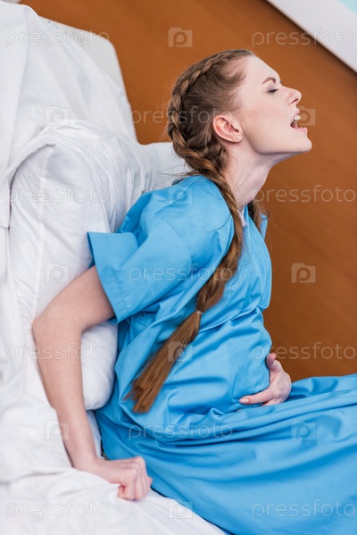 Вид сбоку беременной женщины, рожающей в больнице
