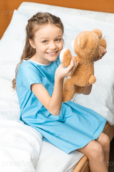 Маленький пациент с плюшевым мишкой, сидя на кровати в больнице
