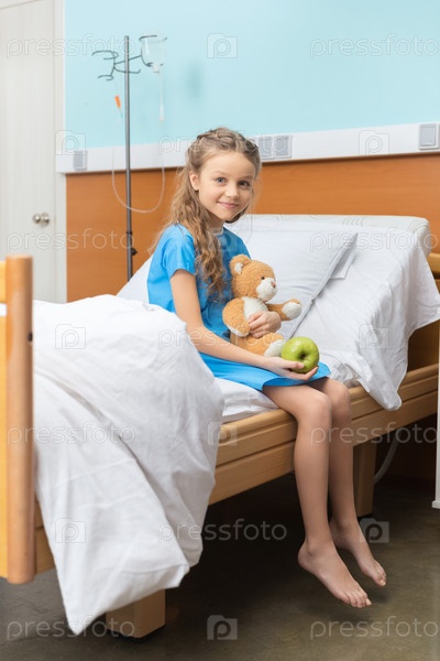 Маленький пациент с плюшевым мишкой, сидя на кровати в больнице