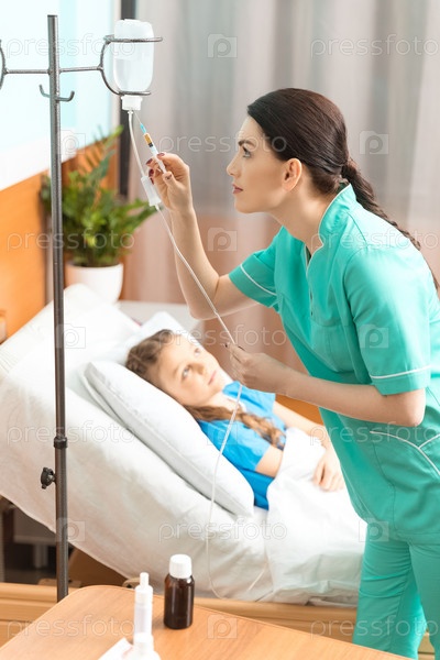 Доктор с капельницей и маленький пациент, лежа на кровати в больнице
