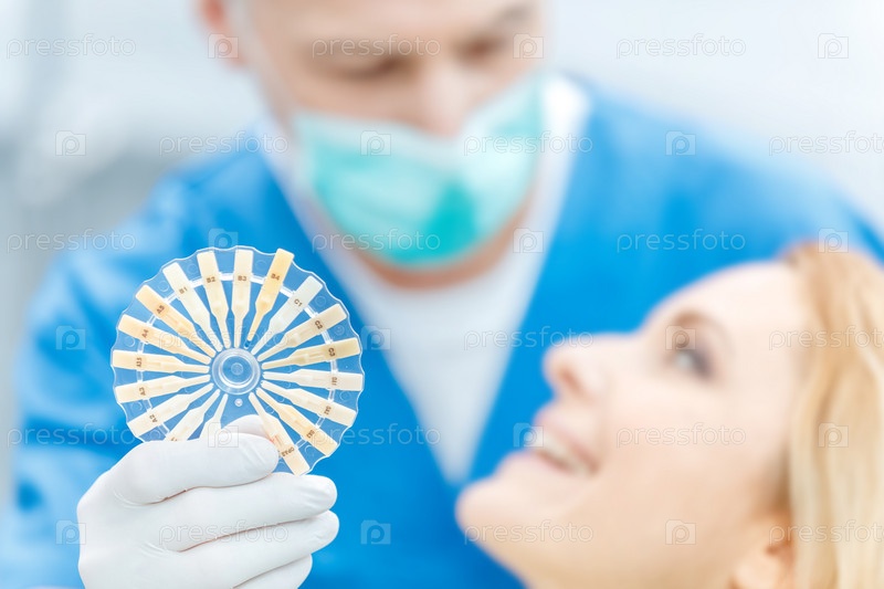 Стоматолог проверяет соответствия цвета зубов с палитрой в стоматологической клинике