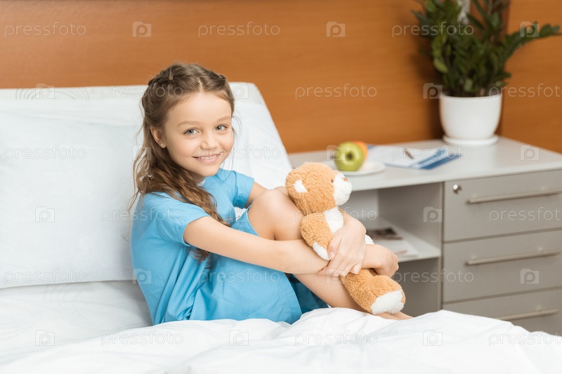 Маленький пациент с плюшевым мишкой, сидя на кровати в больнице