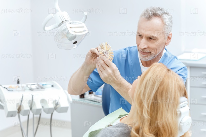 Стоматолог проверяет соответствия цвета зубов с палитрой в стоматологической клинике