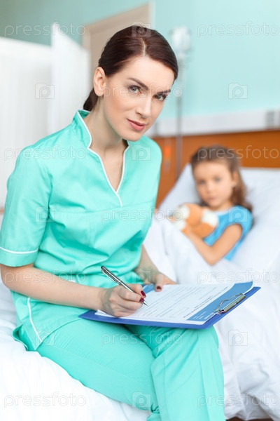 Женщина-врач пишет диагноз болезни маленькой девочки