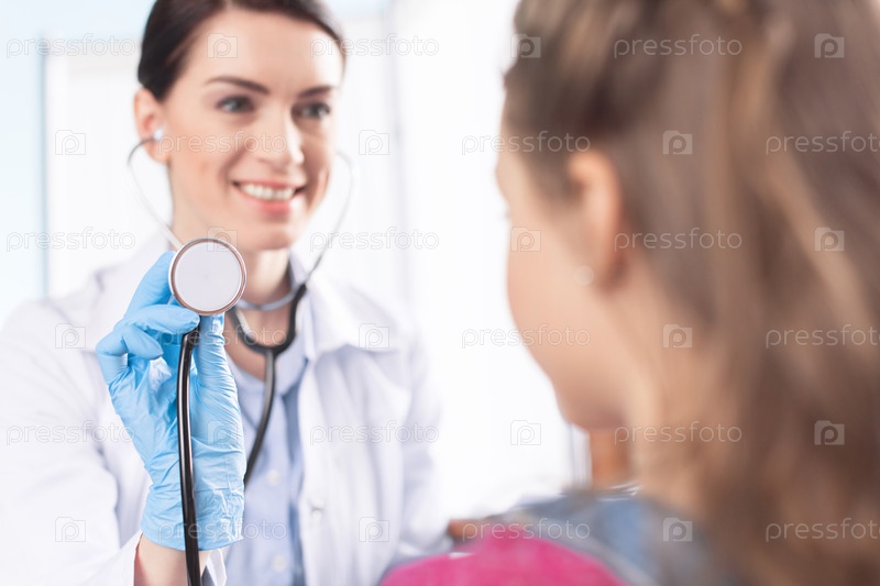 Женщина-врач со стетоскопом, глядя на маленькую девочку