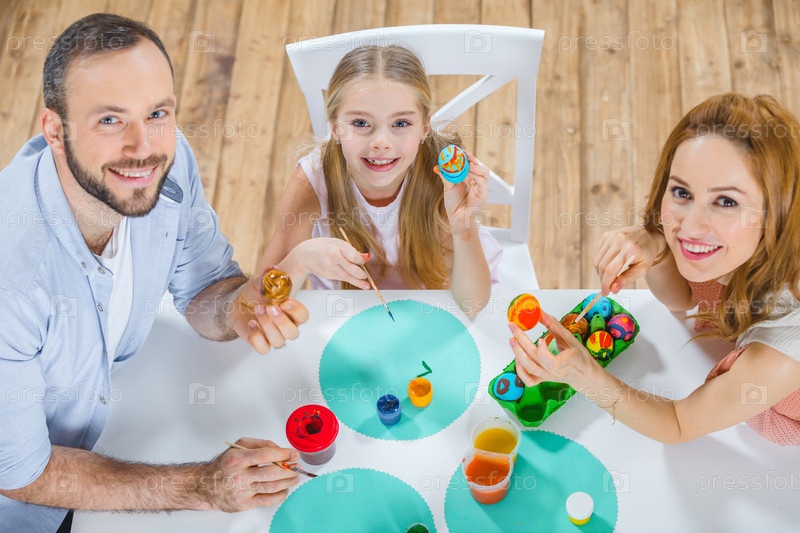 Семья красит пасхальные яйца