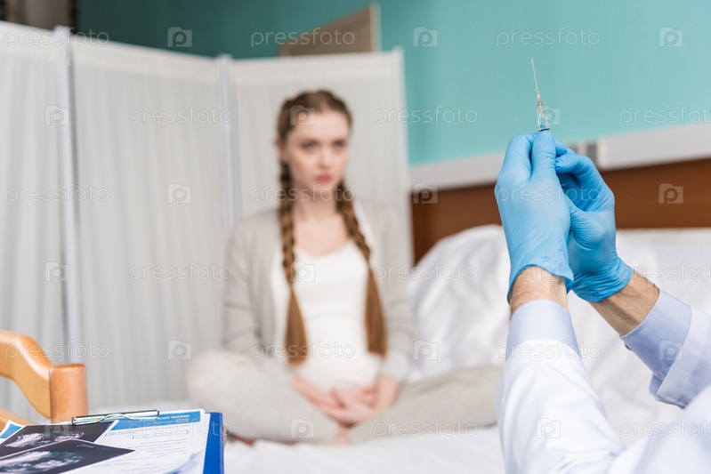 Молодая беременная женщина, сидя на больничной койке и глядя на врача