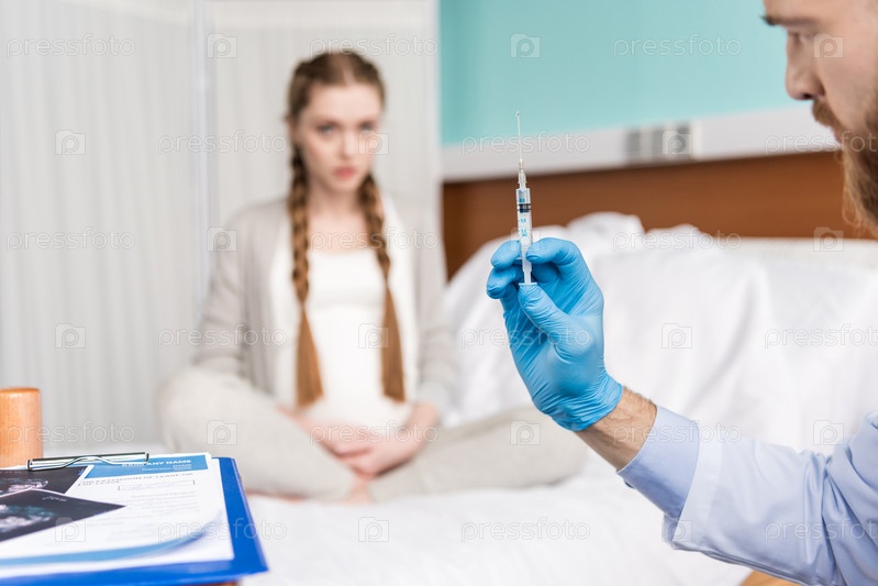 Молодая беременная женщина на больничной койке, глядя на врача со шприцем