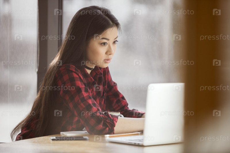 Сконцентрированная молодая женщина в клетчатой рубашке, используя ноутбук в кафе