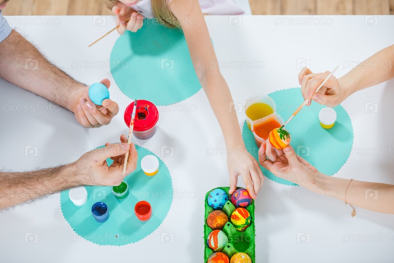 Семья красит пасхальные яйца
