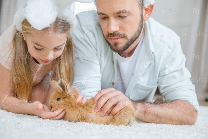 Отец и дочь играют с кроликом