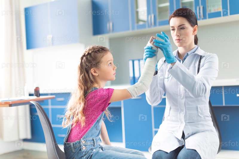 Женщина-врач перевязывает руку маленькой девочки в больнице