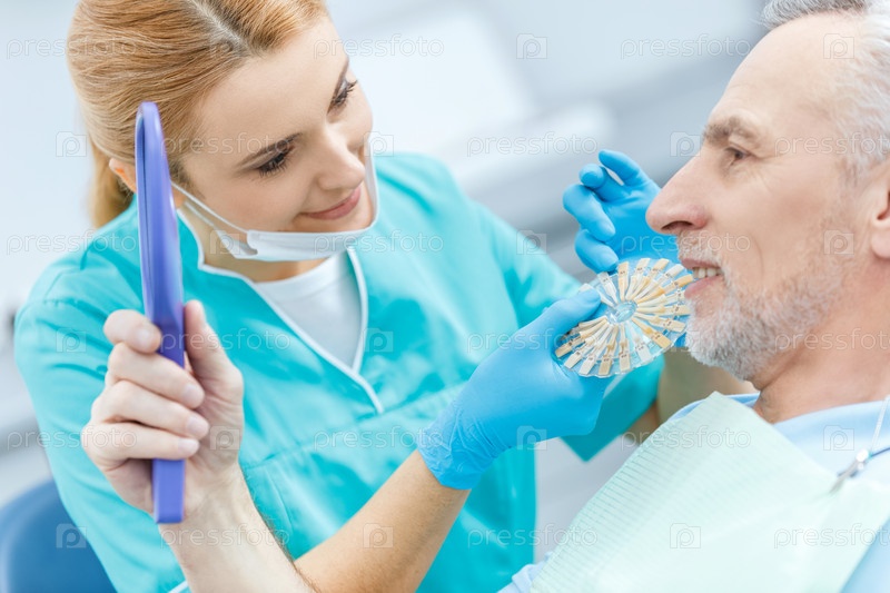 Профессиональный стоматолог с образцами сравнения зубов зрелого пациента
