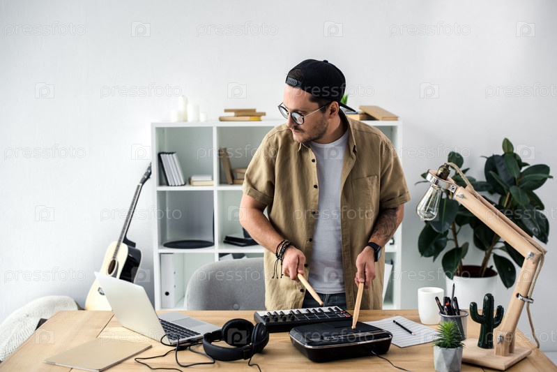 Молодой звукорежиссер играет на драм-машине с палочками