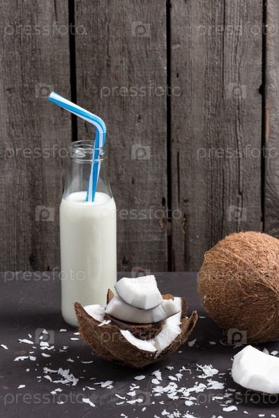 Кокосовые кусочки с молоком в стеклянной бутылке