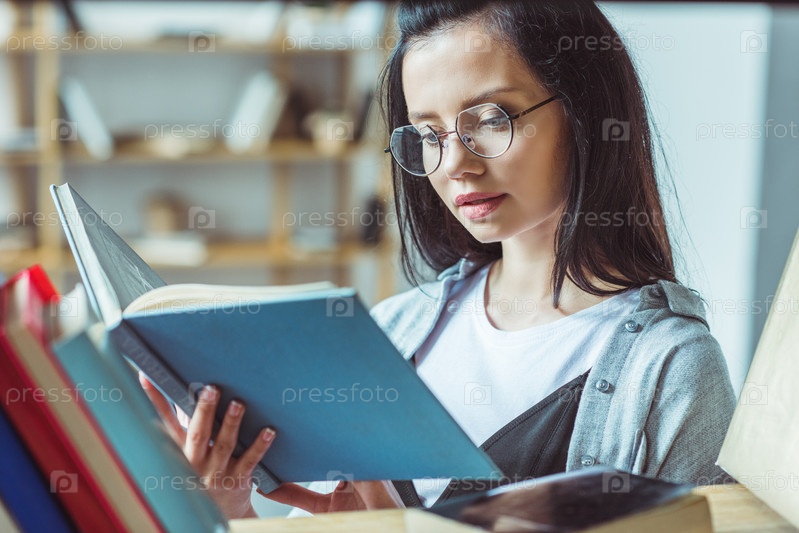 Красивая молодая женщина в очках для чтения книги в библиотеке
