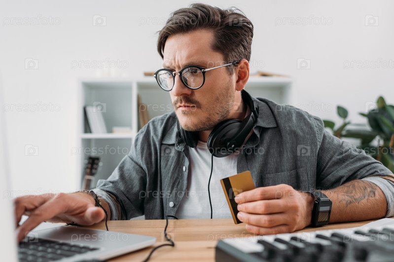 Серьезный молодой человек, совершая покупки с ноутбуком и кредитной картой
