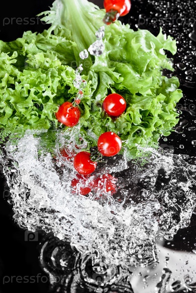 Красные помидоры и зеленый салат в воде