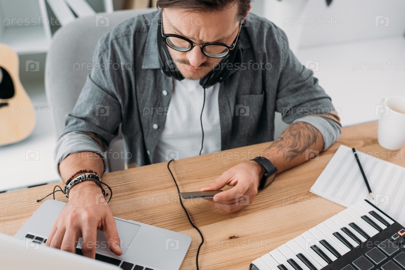 Сконцентрированный человек делает электронную покупку с ноутбуком и кредитной картой